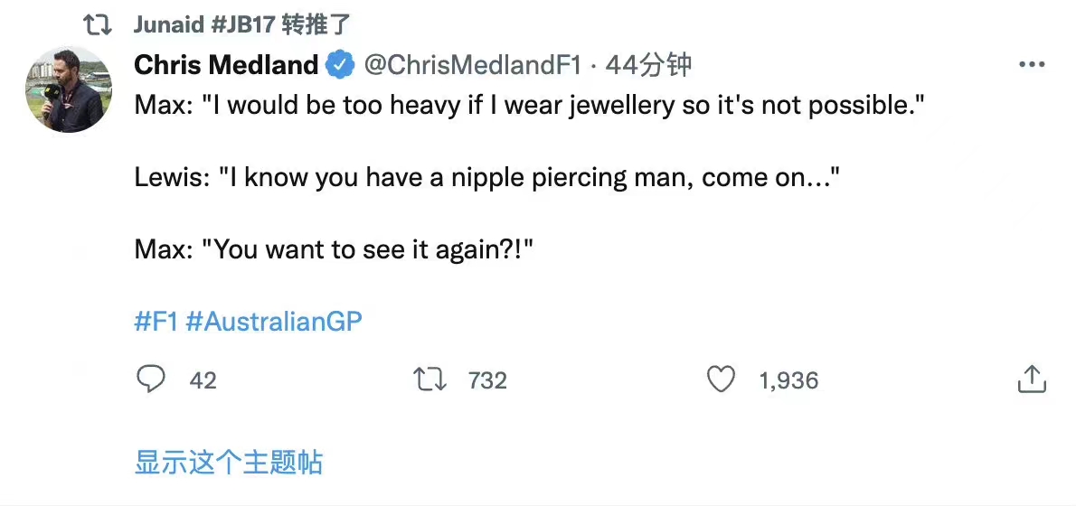 在媒体发布会上,F1名记Chris Medland记录了汉密尔顿和维斯塔潘之间一段有趣的对话。