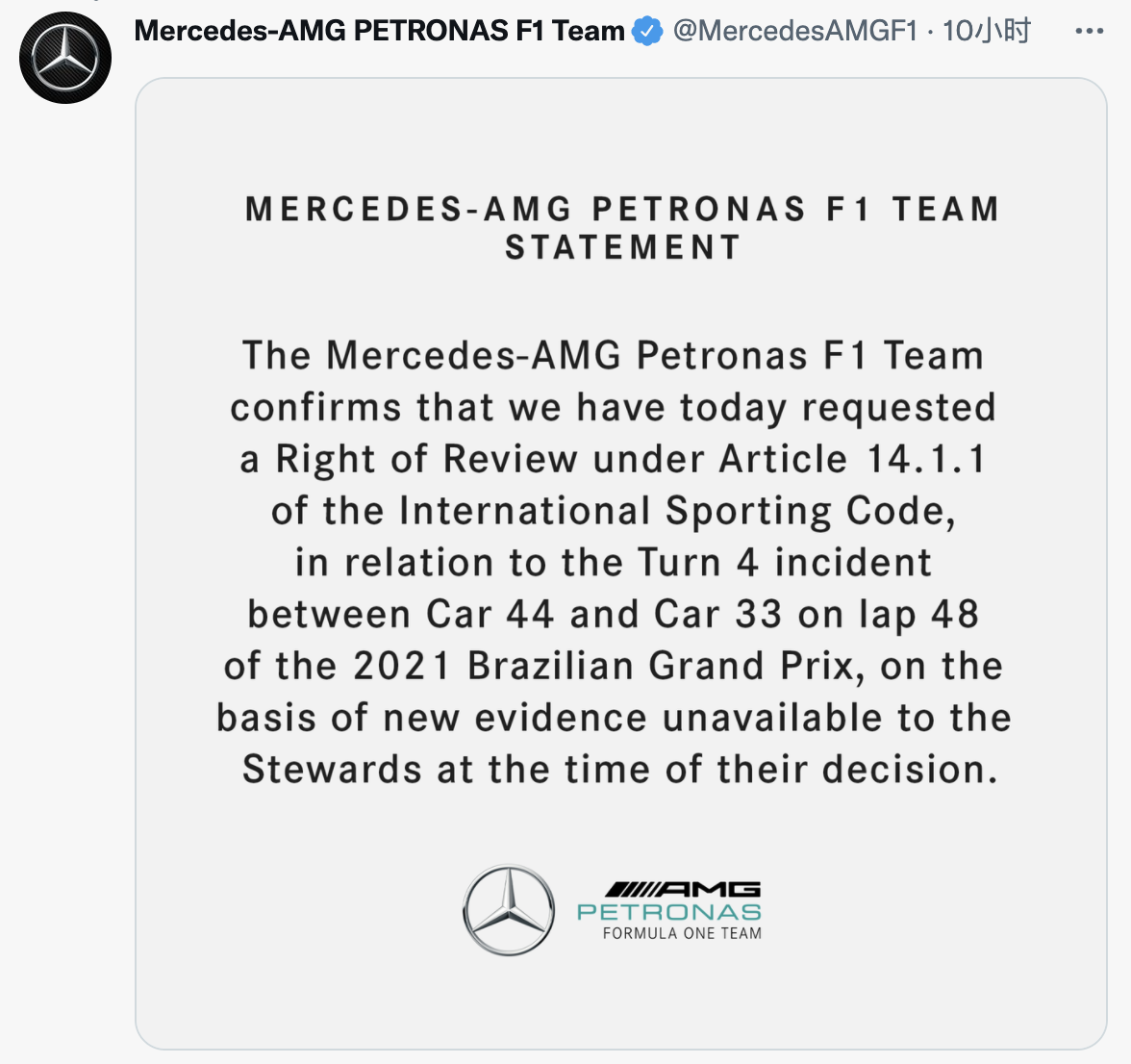 梅赛德斯在官方社交媒体发布的声明中写道:“梅赛德斯-AMG马石油F1车队确认,针对2021巴西大奖赛第48圈44号赛车与33号赛车在4号弯的事件,基于仲裁作出裁决时没有得到的新证据,今天我们已经根据《国际体育规章》第14.1.1条要求重审的权利。