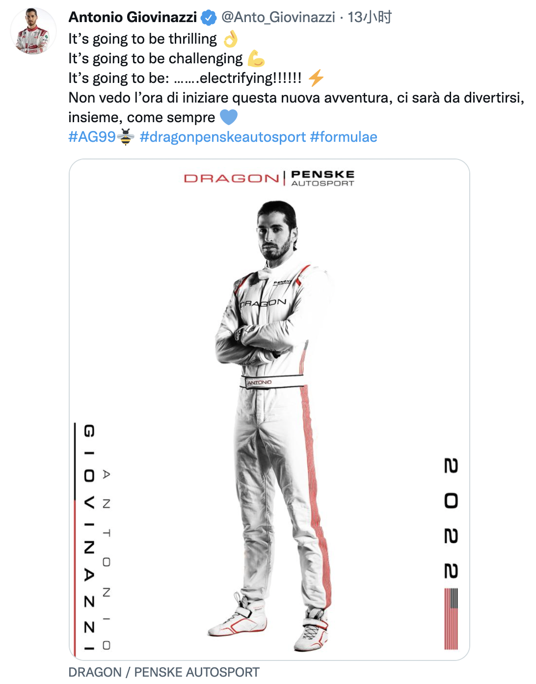 在周冠宇官宣明年加入阿尔法罗密欧之后,吉奥维纳兹在个人社交媒体上宣布,自己明年将加入龙之队Dragon Penske车队征战明年的FE电动方程式世界锦标赛,并发布了自己的新车队定妆照。