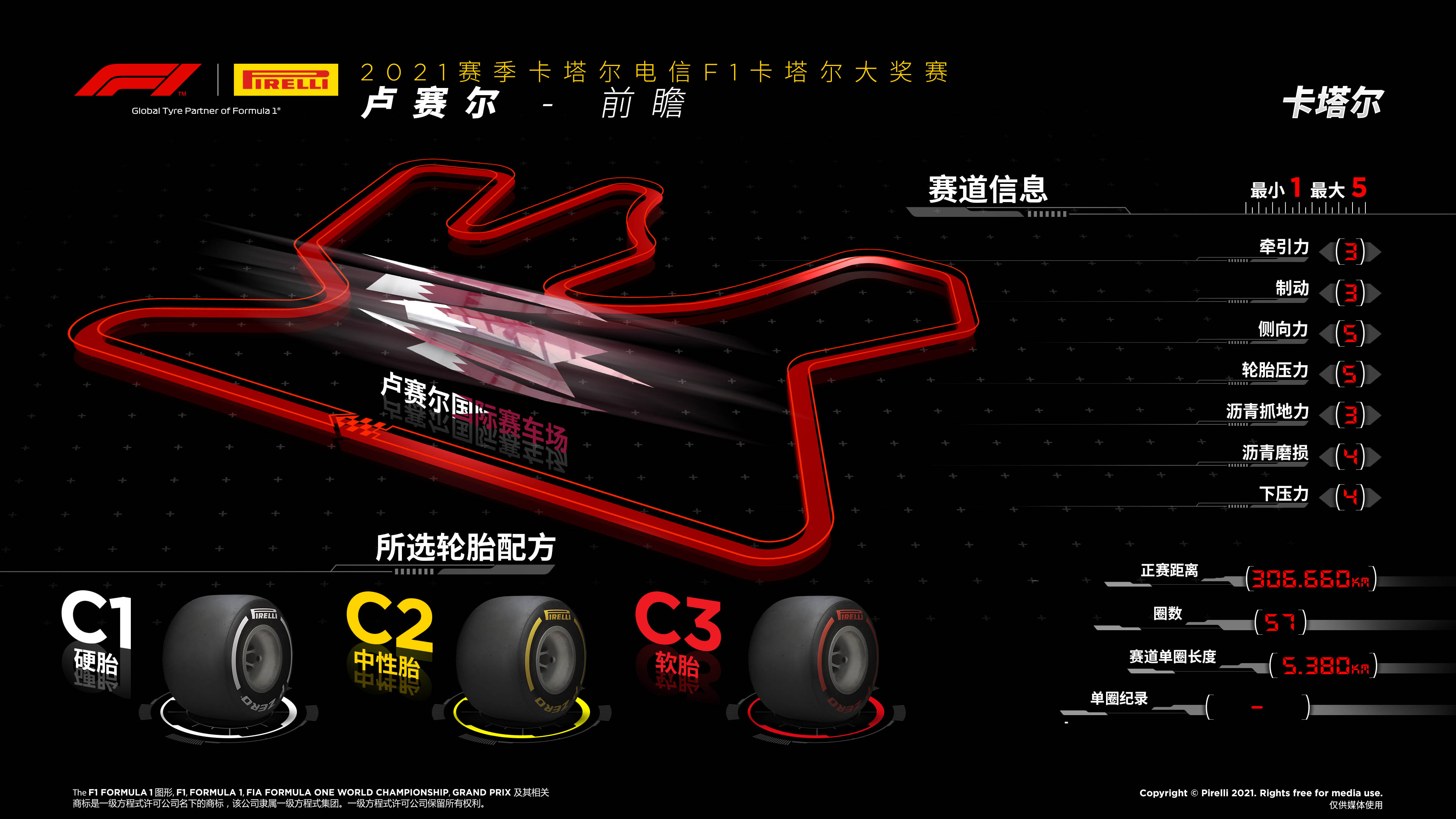 倍耐力为本周末的卡塔尔大奖赛带来了C1, C2, C3的最硬轮胎配方组合,这是今年第五次、也是赛季最后一次提名最硬轮胎组合。
