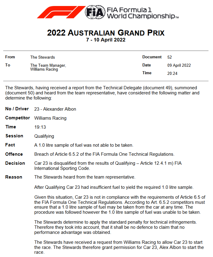 FIA发布文件,由于赛会未从阿尔本油箱中取出1升燃油,他的排位赛成绩被取消。