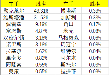 根据国外概率网站数据,勒克莱尔和维斯塔潘夺冠的概率大幅领先于其他车手,二人分别为43.31%和31.52%,其次是佩雷兹的9.19%,法拉利另一位车手塞恩斯排位赛成绩虽不理想,但仍4.87%的夺冠概率,排名第四;汉密尔顿第五,概率为3.18%;周冠宇并列第十四,概率为0.04%。