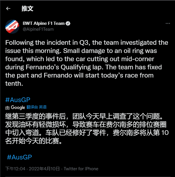 Alpine发布推特:在昨天的排位赛中,阿隆索赛车活塞环出现问题,现在已经修好,本场比赛将在P10出发。