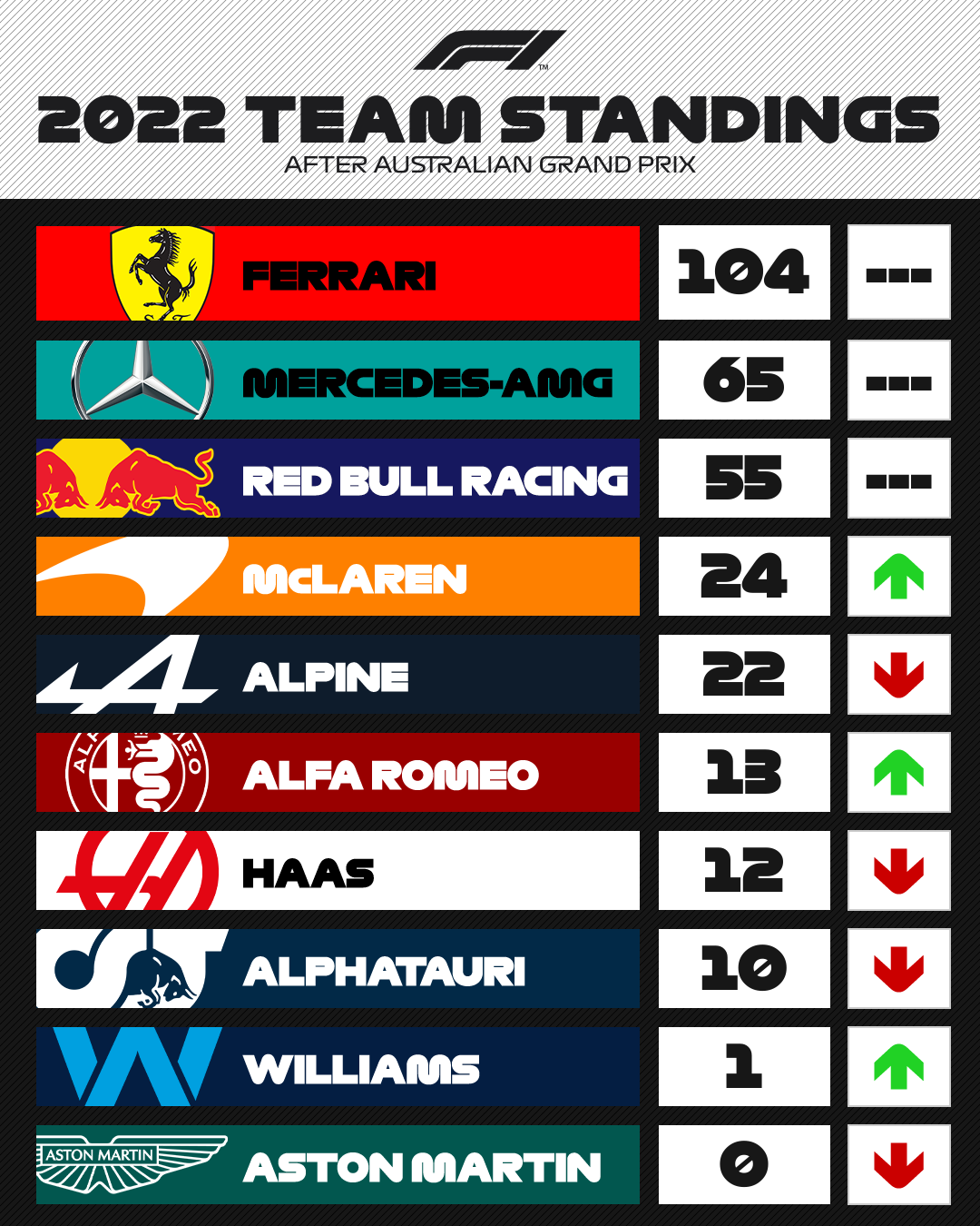 澳大利亚赛后车队积分榜:法拉利一骑绝尘