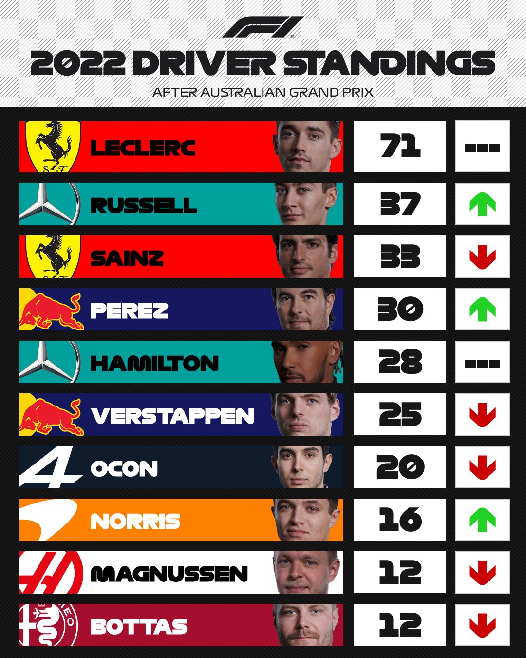 澳大利亚赛后车手积分榜:勒克莱尔第一、拉塞尔升至第二