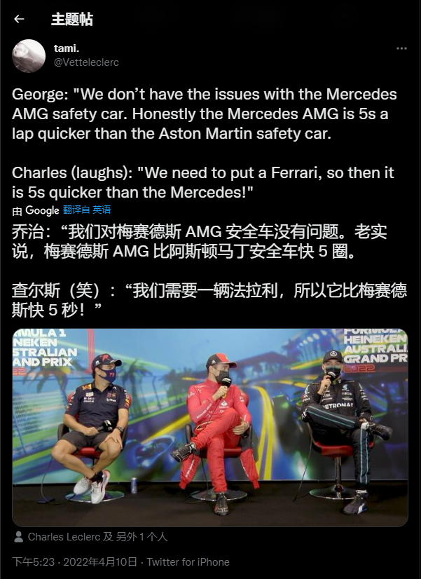 在赛后新闻发布会上,三位领奖台车手也互相之间开起了玩笑。拉塞尔说:“AMG的安全车会比马丁的安全车快5秒。”勒克莱尔立马插话道:“那我们现在需要一辆法拉利当安全车,它会再快五秒”