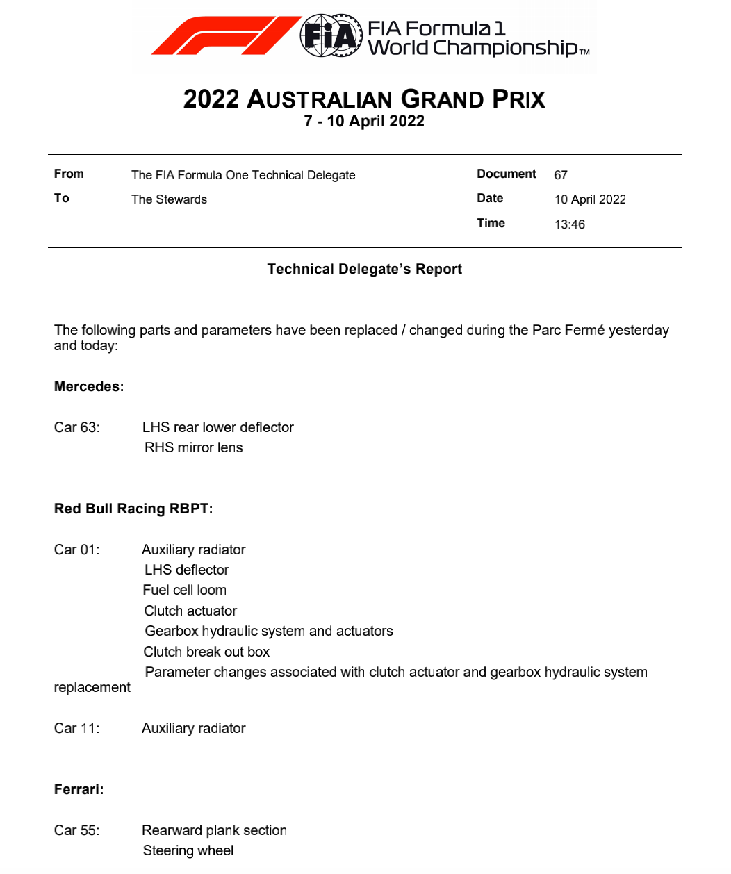 根据FIA给出的技术报告,维斯塔潘的赛车在赛前曾经更换了多个部件,其中包括离合器致动器、变速箱液压系统和致动器和离合器接线盒等部件。