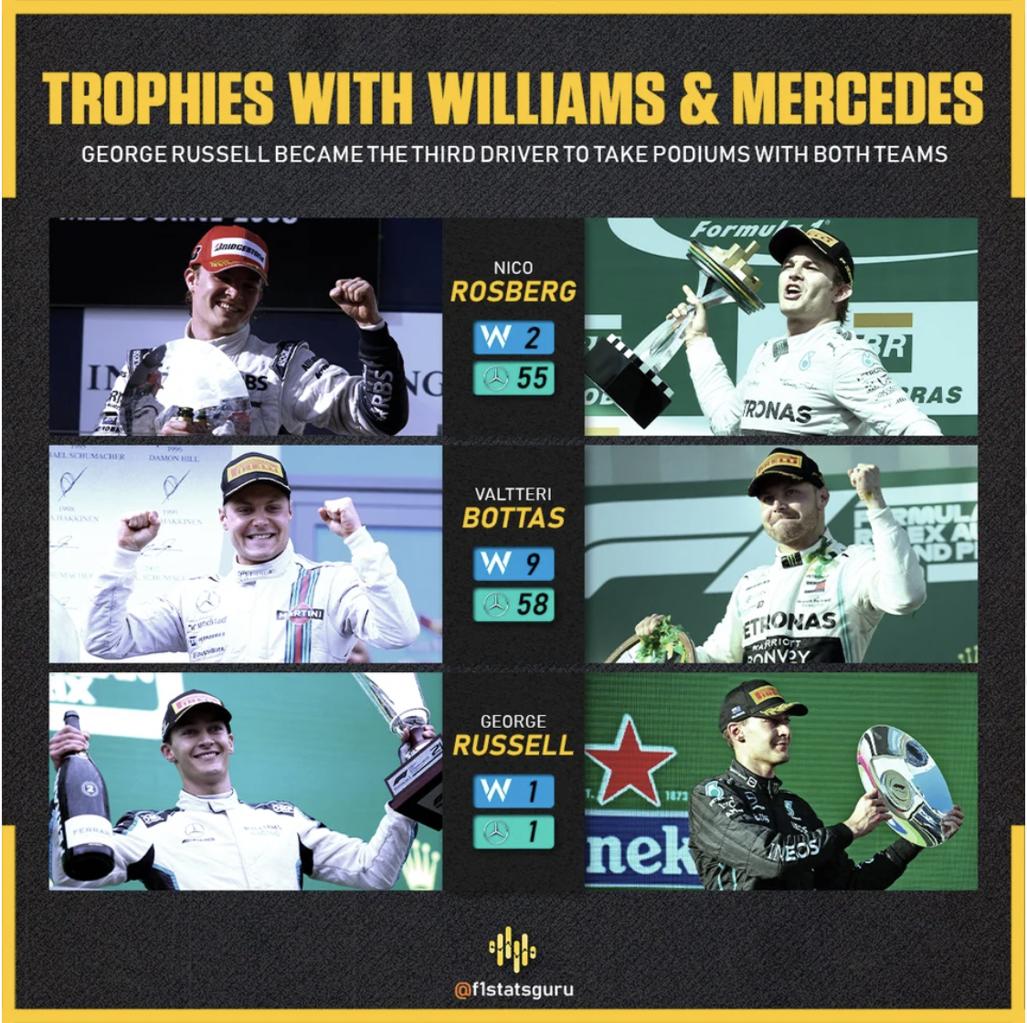 小纪录:拉塞尔是第3位同时代表威廉姆斯和梅赛德斯登上领奖台的车手