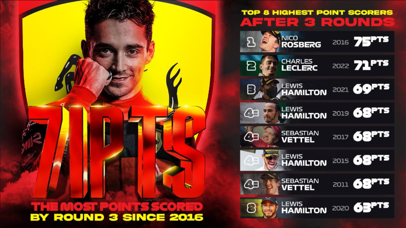 勒克莱尔凭借本赛季的优异表现,已经获得了71个积分,而这也是自2016年以来最高的车手前三轮积分。