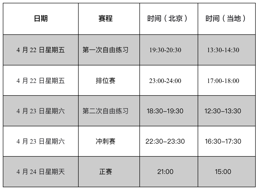 第一节自由练习依旧会在周五进行,时长为1小时。而周五稍晚时间会进行三节排位赛。