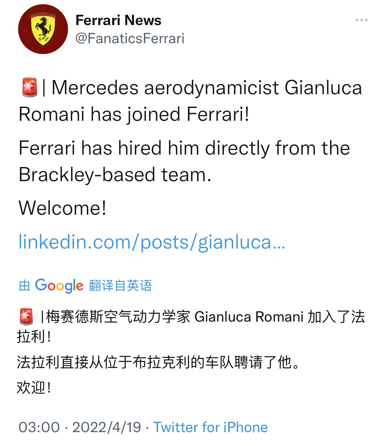 据Twitter博主爆料,梅赛德斯空气动力学家Gianluca Romani加入了法拉利。