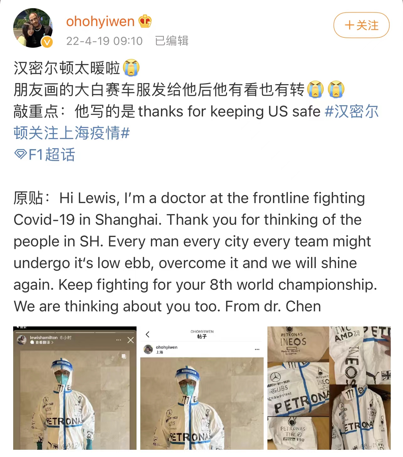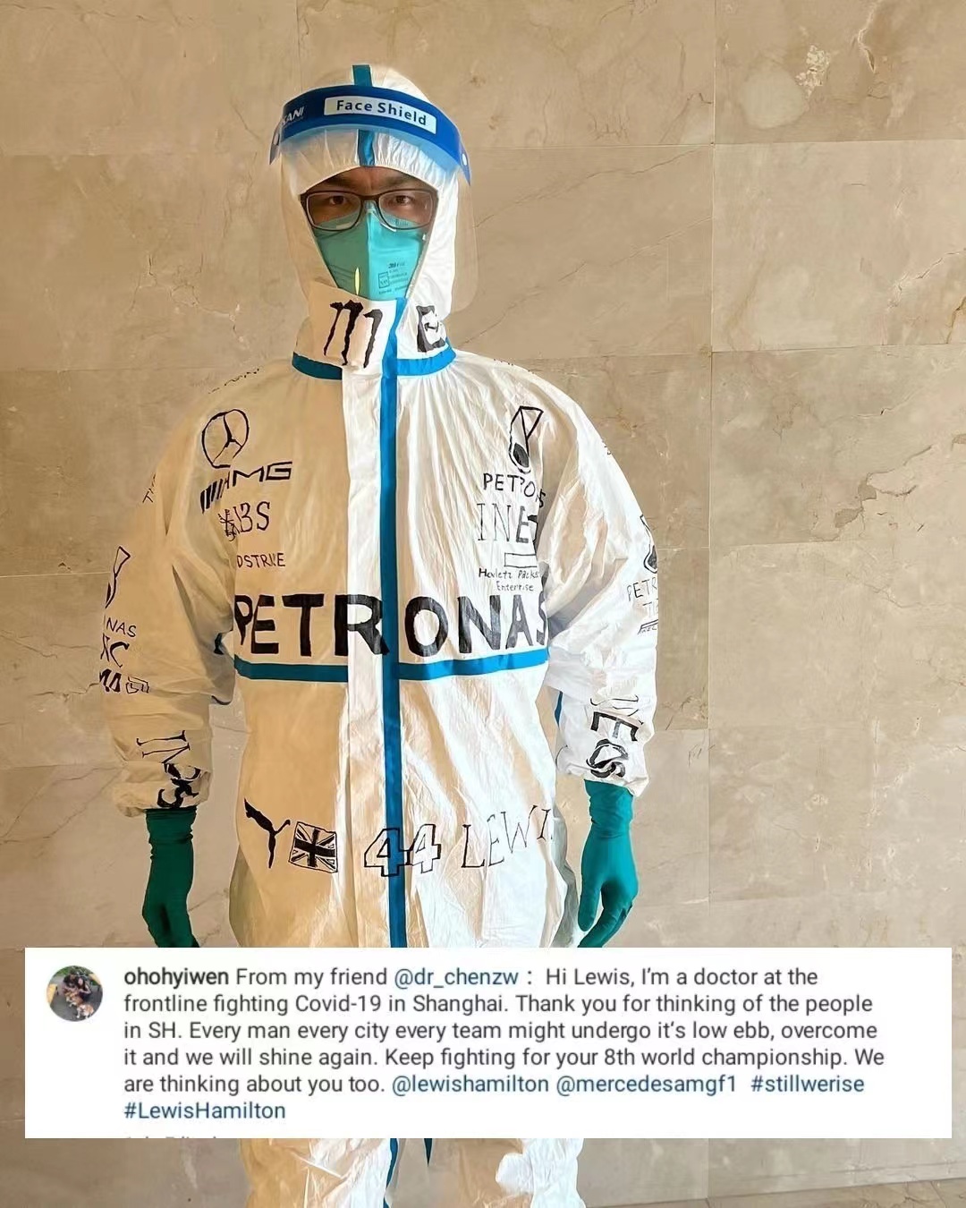 今早,汉密尔顿转发了一条上海“大白”的Ins,随后机智的网友们发现,图中身着“梅赛德斯”防护服的就是今年巴林站五星体育的嘉宾解说陈医生。