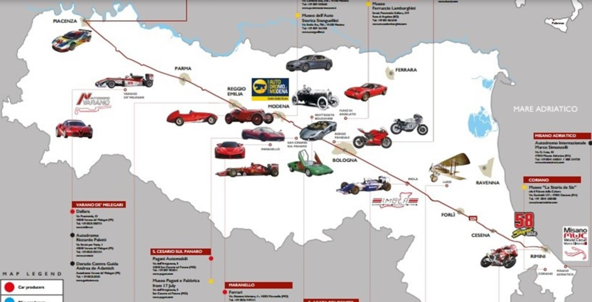 罗马涅被称为“车谷”(Motor Valley)是因为这里的赛车制造商非常密集。法拉利、玛莎拉蒂、帕加尼、兰博基尼、杜卡迪都在这里设有工厂。车谷的中心是摩德纳(Modena),这里也是恩佐·法拉利的诞生地。这片土地上的人们对赛车、汽车和摩托车饱含热情,对速度的追捧已经成为了他们文化的组成部分。