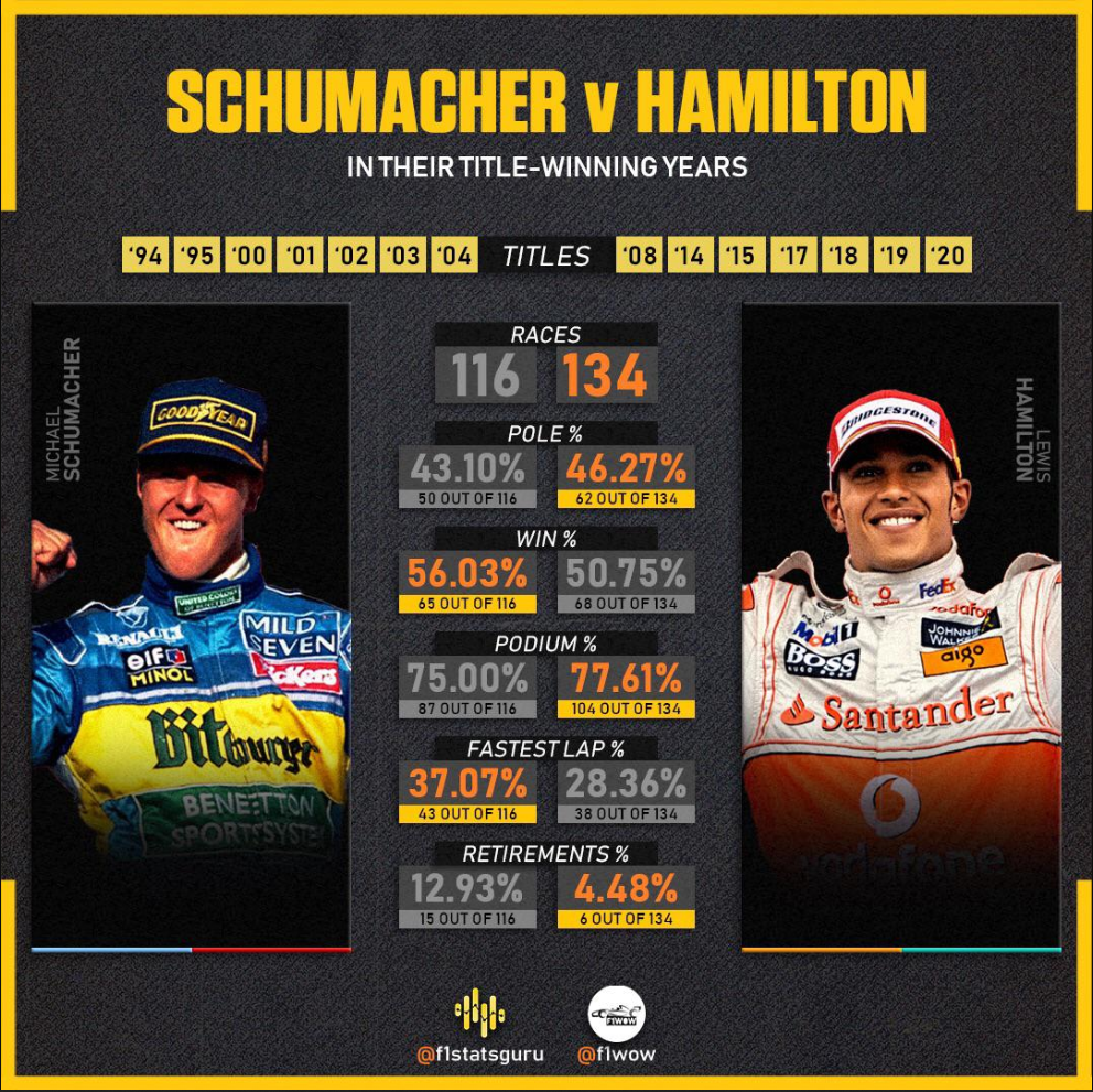作为历史上仅有的两位7冠王,舒马赫在94、95、00、01、02、03以及04赛季夺得了车手总冠军,而汉密尔顿则是分别在08、14、15、17、18、19、20赛季获得冠军。