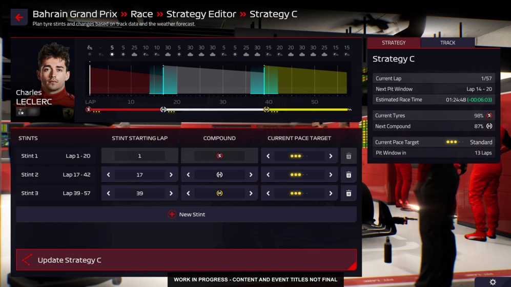 正赛可以提前制定不同的比赛策略,在比赛时控制车手进站换胎,如果由安全车或天气变化,还可以随时对计划进行调整。