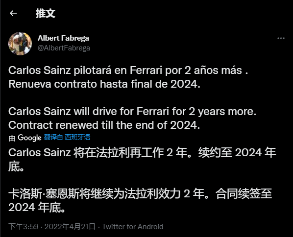 据F1记者Albert Fabrega推特,塞恩斯已与法拉利成功续约至2024年。