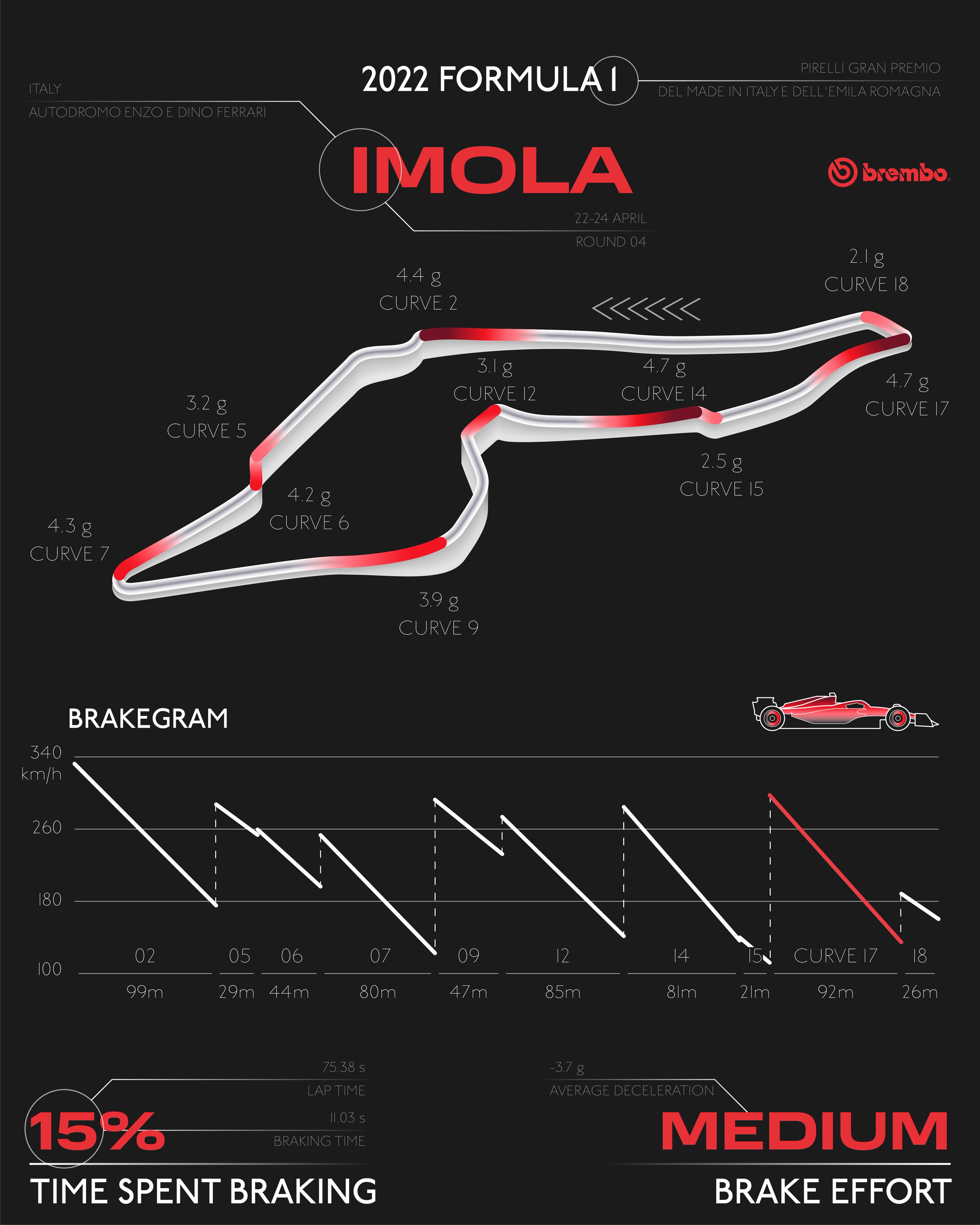 布雷博发布了本周伊莫拉站刹车使用情况预测。