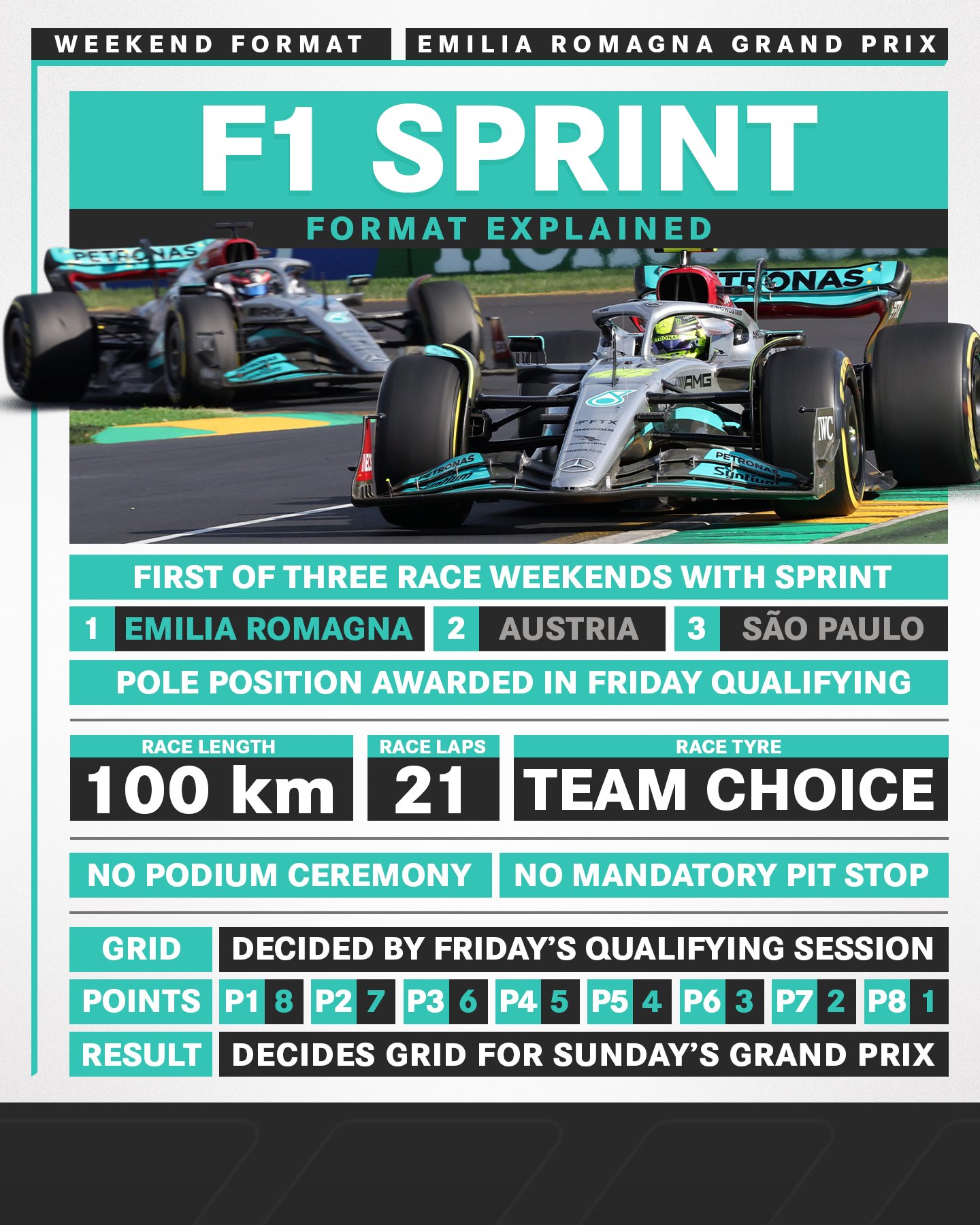 本周在伊莫拉进行的冲刺赛将会完成100公里的里程,赛车共计要进行21圈的比赛,车队可以自行选择轮胎及策略。