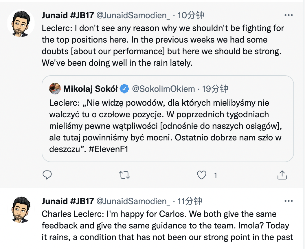 法拉利车手勒克莱尔表示:“虽然过往雨战不是我们的一个强项,但我现在没发现任何我们在这里不能争冠的理由。”