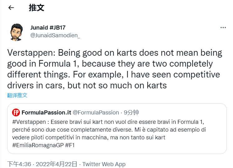 维斯塔潘在赛前发布会上说道:“卡丁车开得好并不意味着在一级方程式中表现优秀,因为它们是两种完全不同的东西。例如,我见过很多开车开得很好的车手,但开卡丁车时完全相反。”