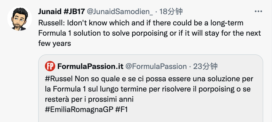 赛前发布会上,拉塞尔表示:“我不知道F1有没有能长效解决海豚跳的办法,还是说我们接下来几年都要面对它。”