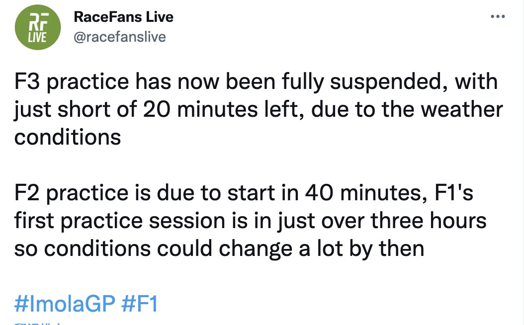 因为天气原因,F3练习赛全部终止,距离正常结束时间还有20分钟。