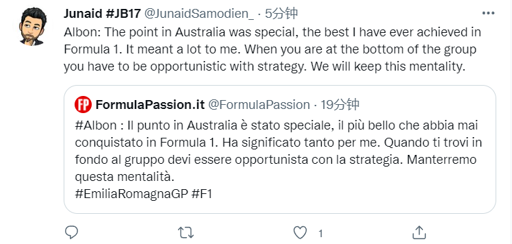 在赛前发布会上,阿尔本对记者说:“在澳大利亚拿分真的非常特别,那是我在F1取得过的最好成就,对于我来说意义重大。当你处于积分榜末尾时,你必须要成为一名懂得使用策略的机会主义者,我们也将保持这种心态。”