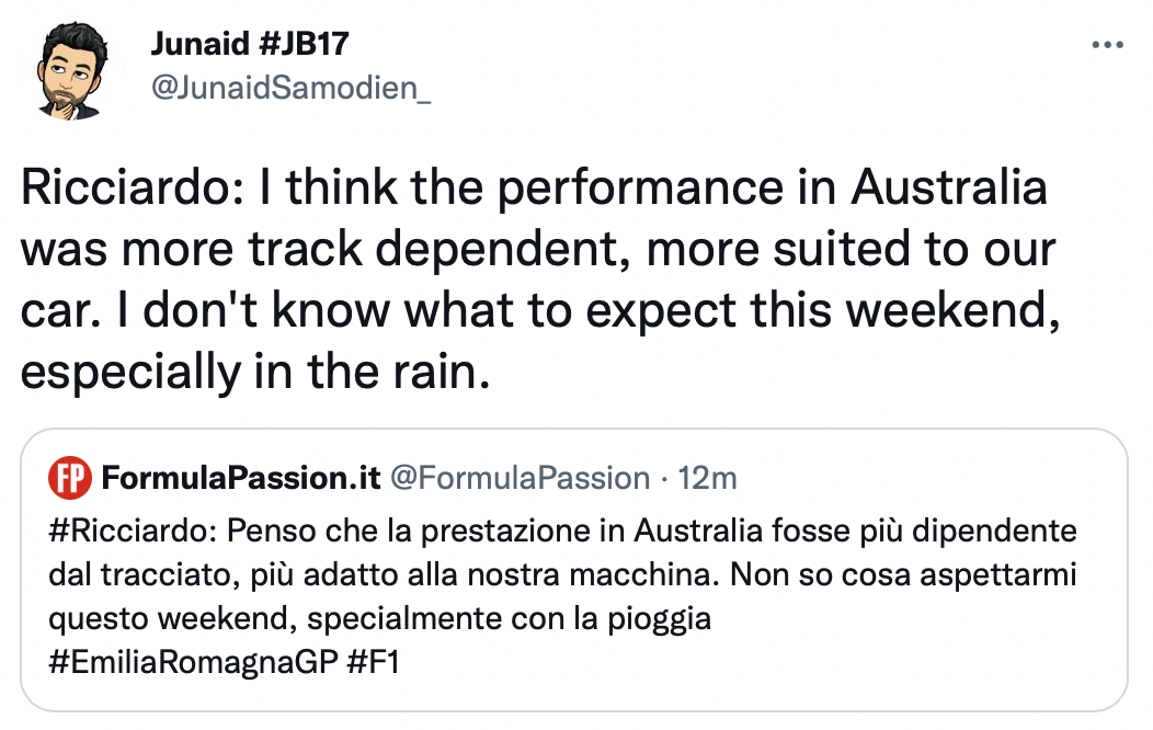里卡多在发布会上说:“我们上一场表现,很大程度是由赛道本身决定的,墨尔本赛道更适合我们的赛车。我不确定这周情况会怎样,尤其还下着雨。”