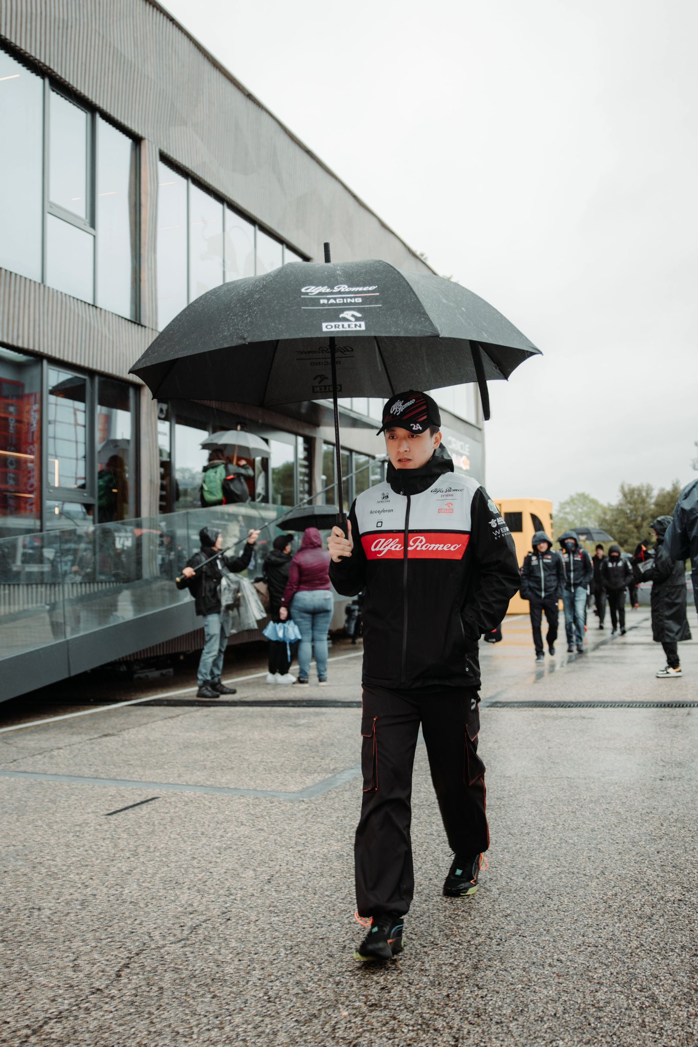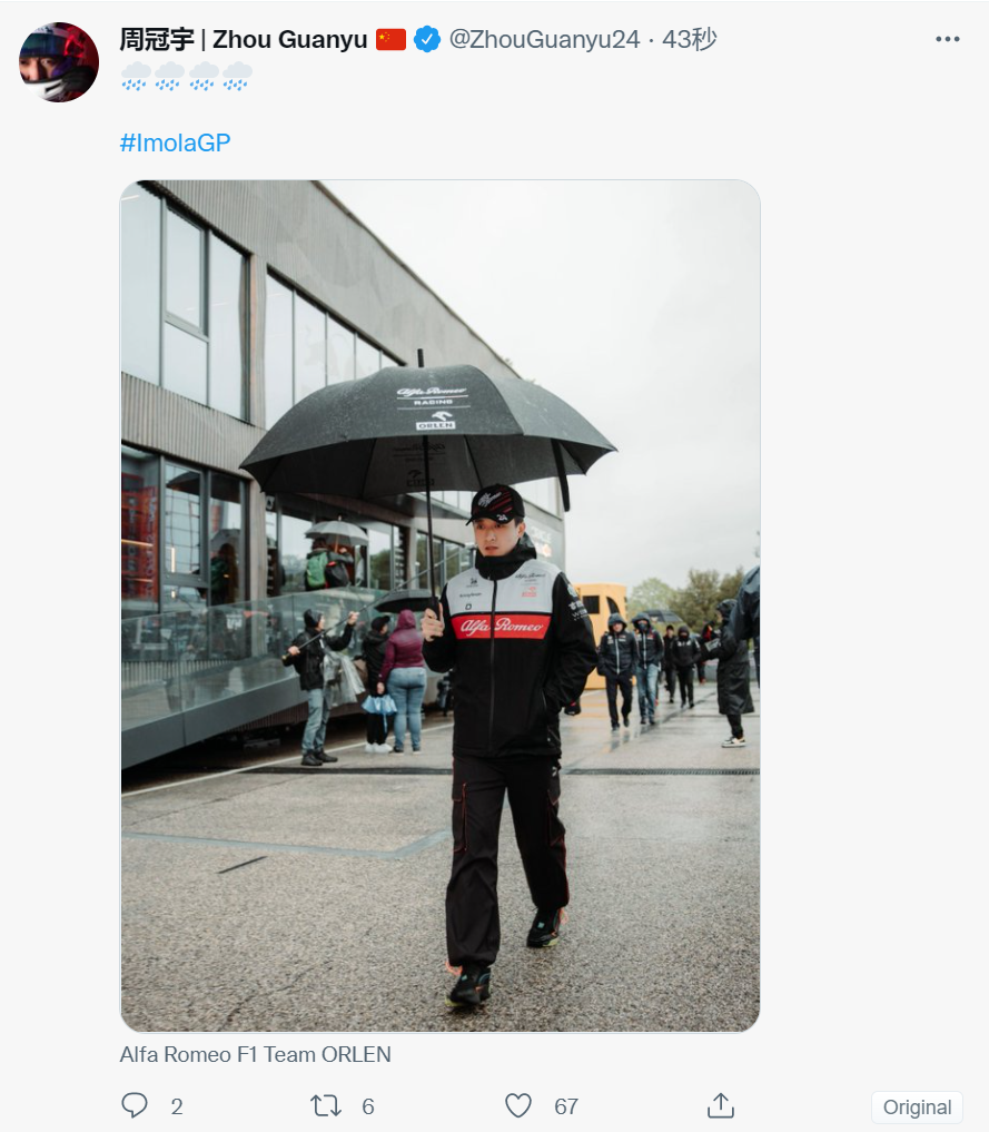 周冠宇在社交媒体更新了照片,自己打着伞走在雨中。