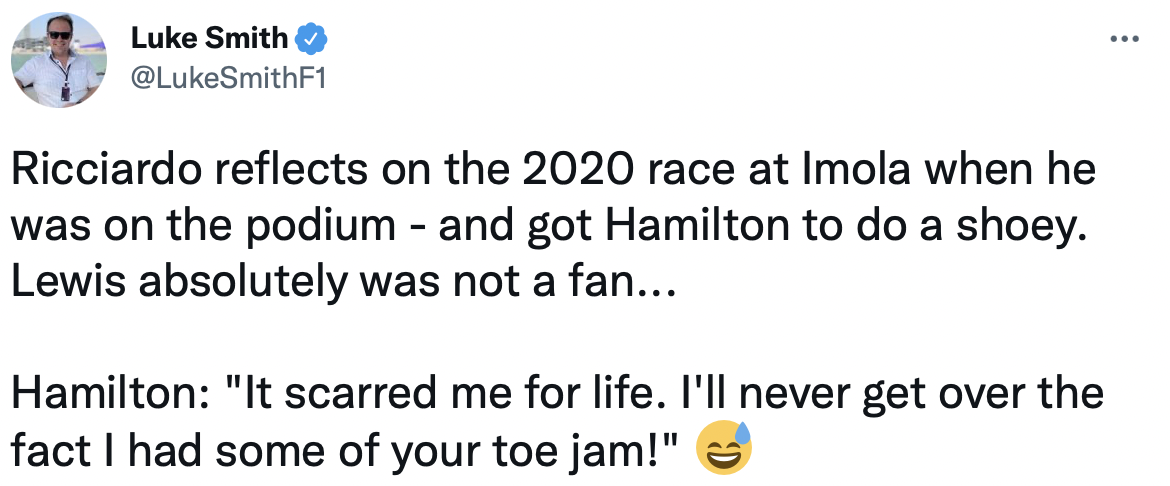 据F1记者Luke Smith的报道,里卡多在记者发布会上回忆了2020年伊莫拉站领奖台上,让汉密尔顿体验了鞋饮一事。汉密尔顿说:“这是我一生的创伤,我永远不能释怀这个事实:喝了你的脚液。”