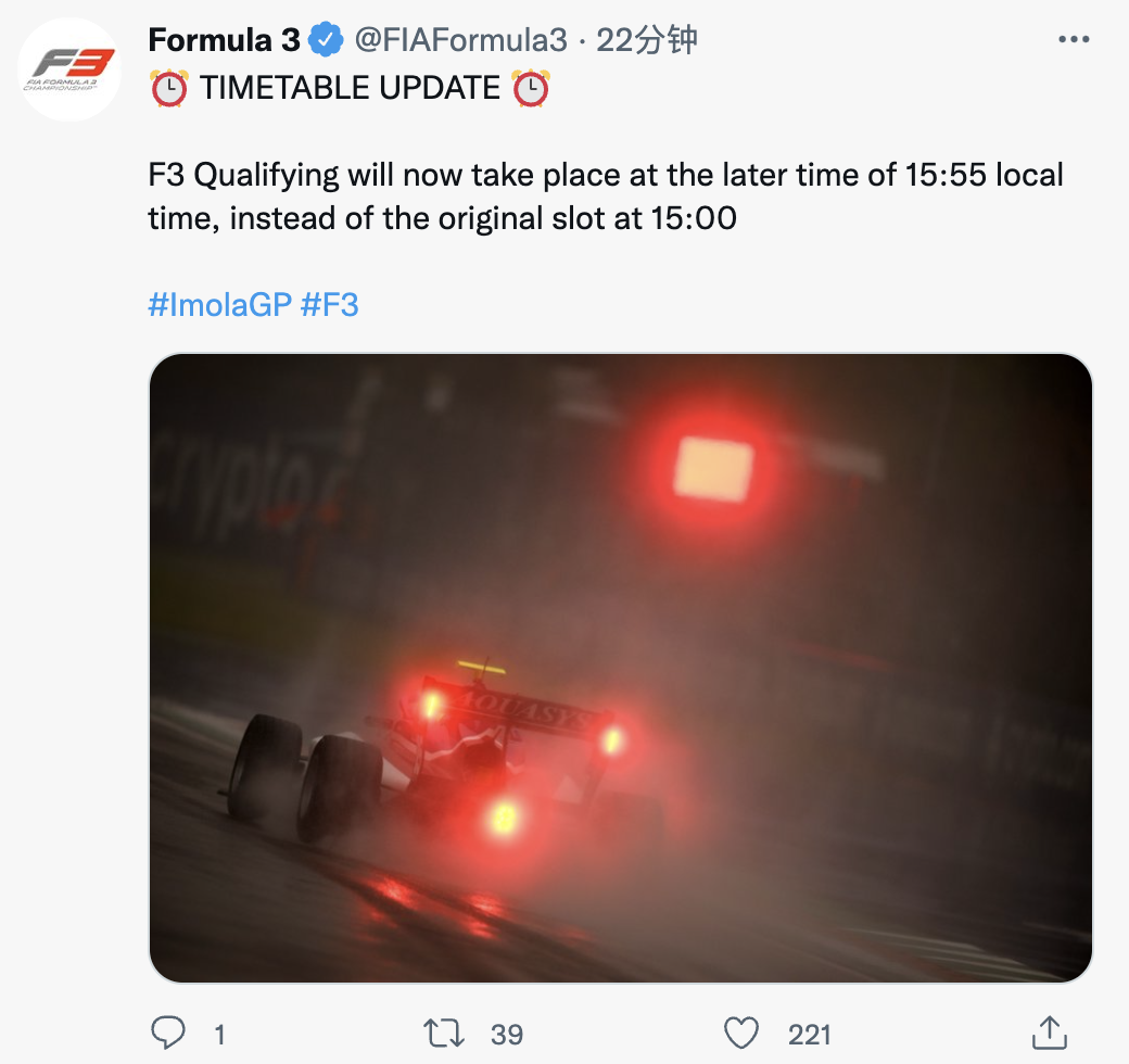 F3伊莫拉站排位赛时间更新,将从原定的北京时间21:00延后到21:55。