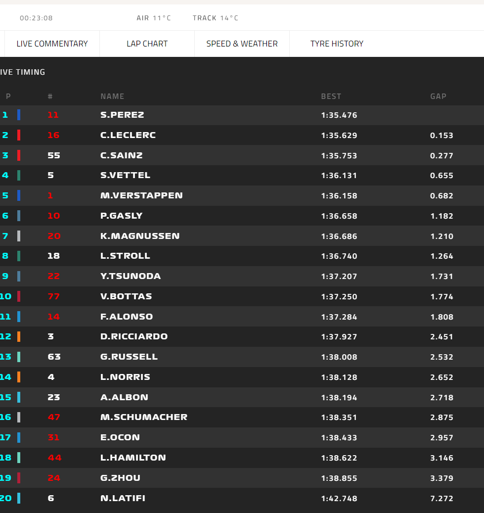 【伊莫拉站一练】FP1还有23分钟,佩雷兹第1周冠宇第19