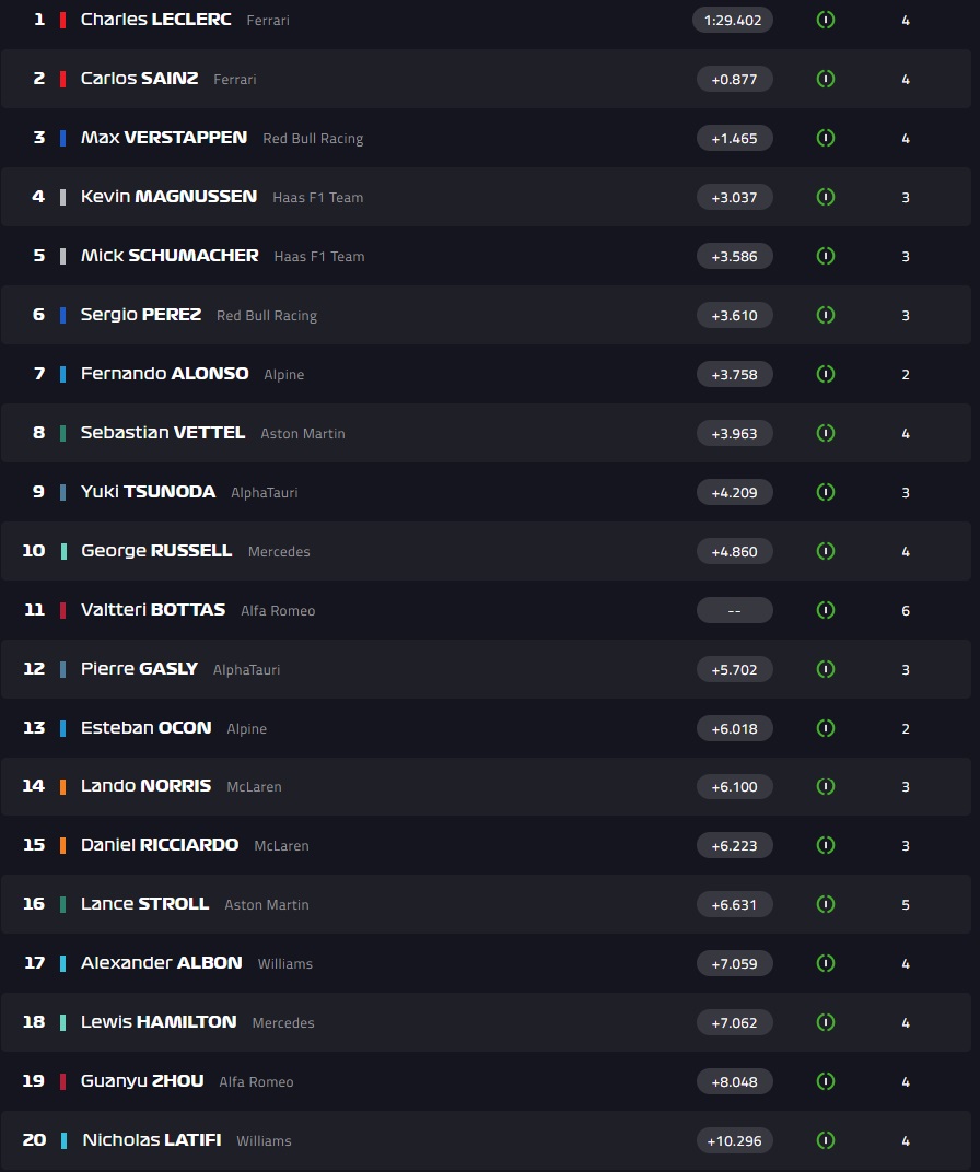 停表后,博塔斯引发黄旗,也让在场上最后做圈速的车手提前结束比赛。最终勒克莱尔排名第一。