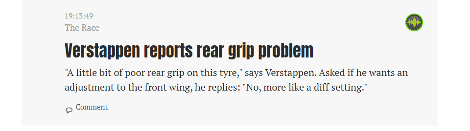 The Race:维斯塔潘向车队汇报:我的后轮抓地力有些不足。 车队问维斯塔潘要不要调整一下前翼。他回答:“不用,更像是设定问题。”