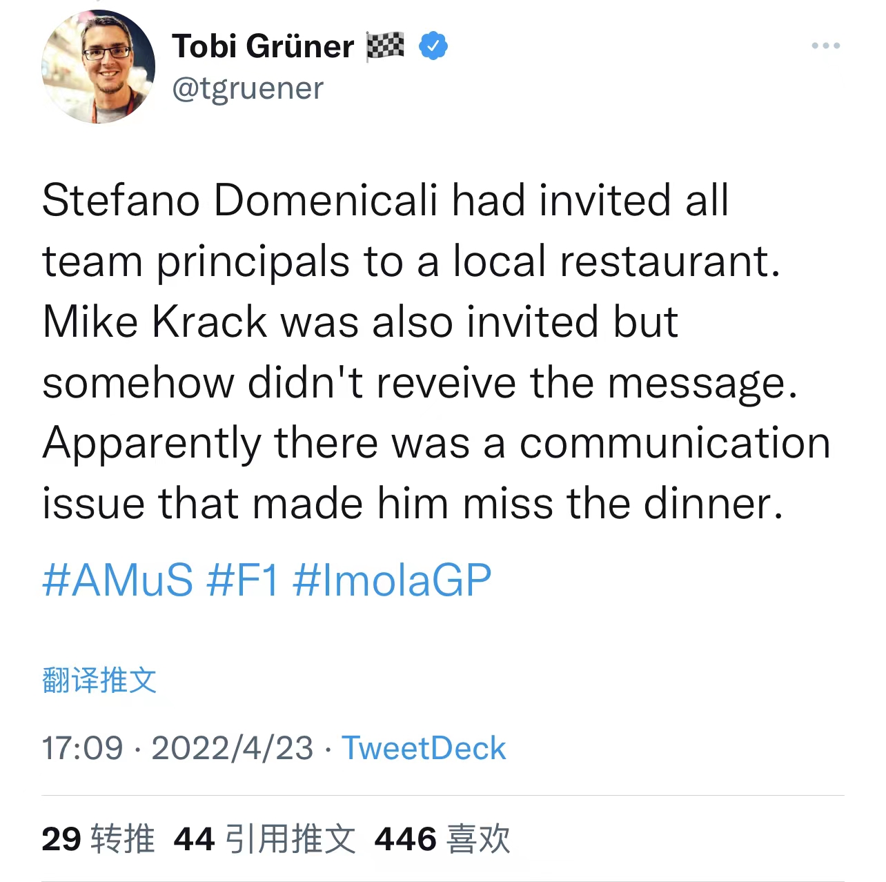 据AMuS记者报道,F1 CEO多梅尼卡利邀请了阿斯顿马丁领队迈克·克拉克参加昨天的领队晚宴,但不知为何,克拉克并没有收到消息。