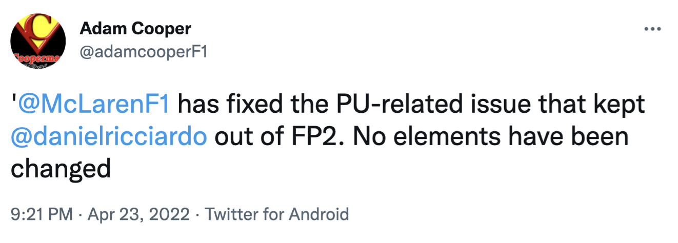 据F1记者Adam Cooper报道,迈凯伦已经将里卡多赛车的动力单元的问题解决。车队没有给他更换新的部件。