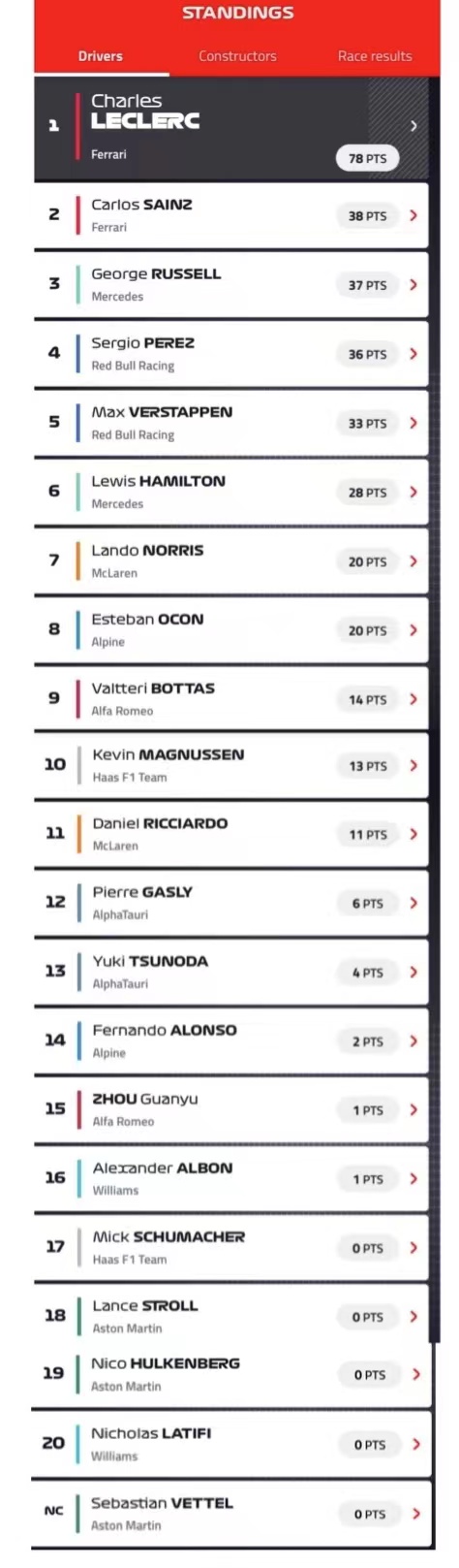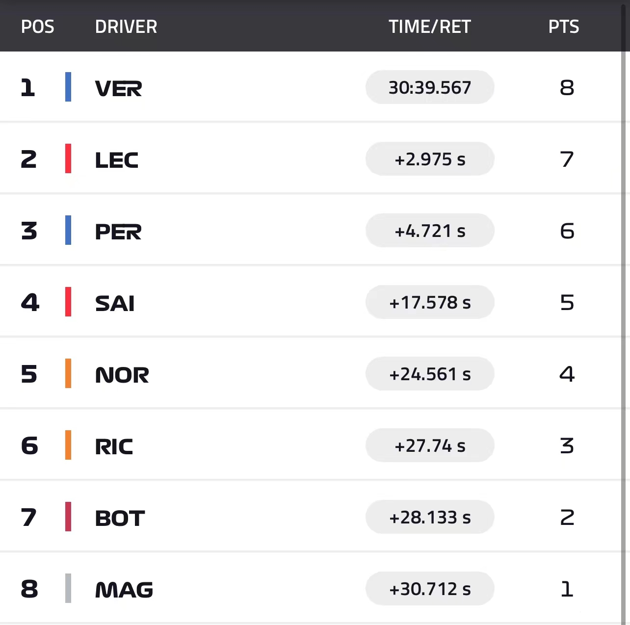 伊莫拉站冲刺赛结束,前八名的车手拿到了宝贵的分数: