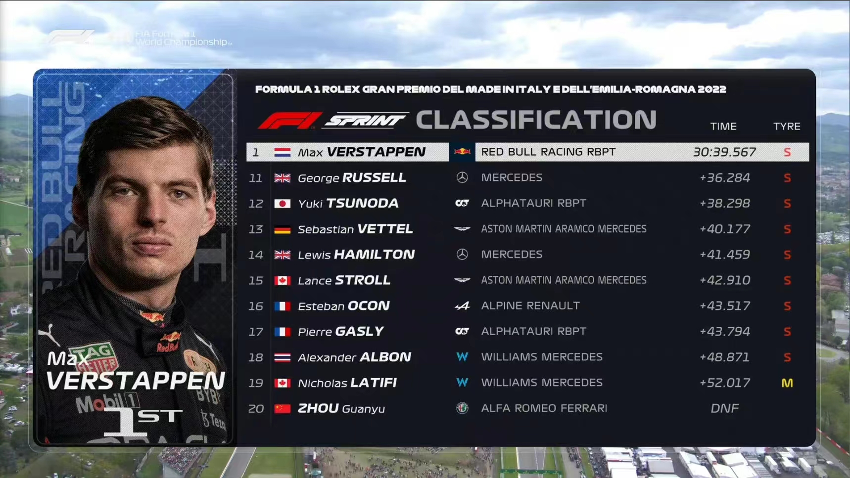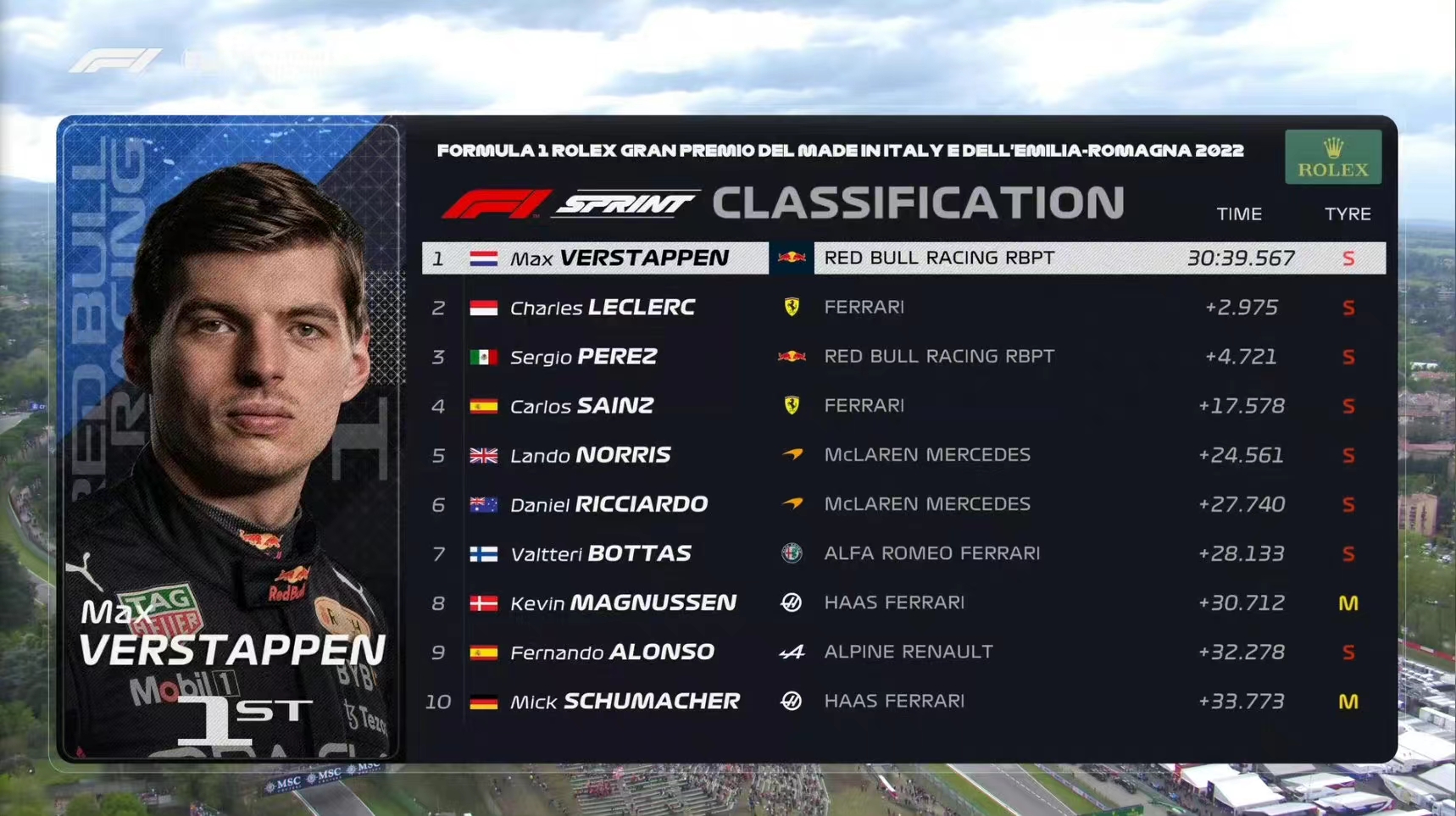伊莫拉站冲刺赛结束,维斯塔潘在起步后落到第2,他在倒数第二圈成功反超勒克莱尔拿到冲刺赛冠军,勒克莱尔遗憾收获第2,佩雷兹排名第3,塞恩斯从第10起步一路超车最后排名第4,周冠宇在第一圈与加斯利相撞,遗憾退赛。博塔斯排名第7,拉塞尔第11,汉密尔顿第14。