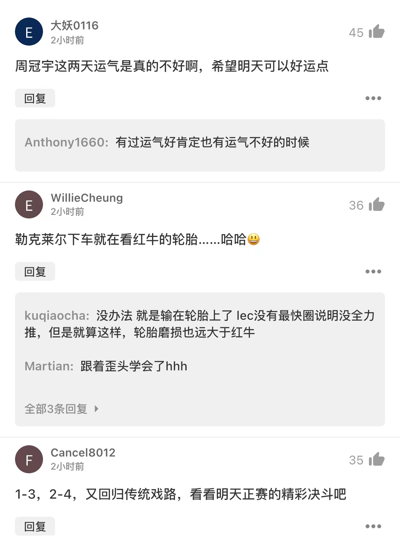 红牛1-3,法拉利2-4,让我们一起期待今天21:00的正赛!