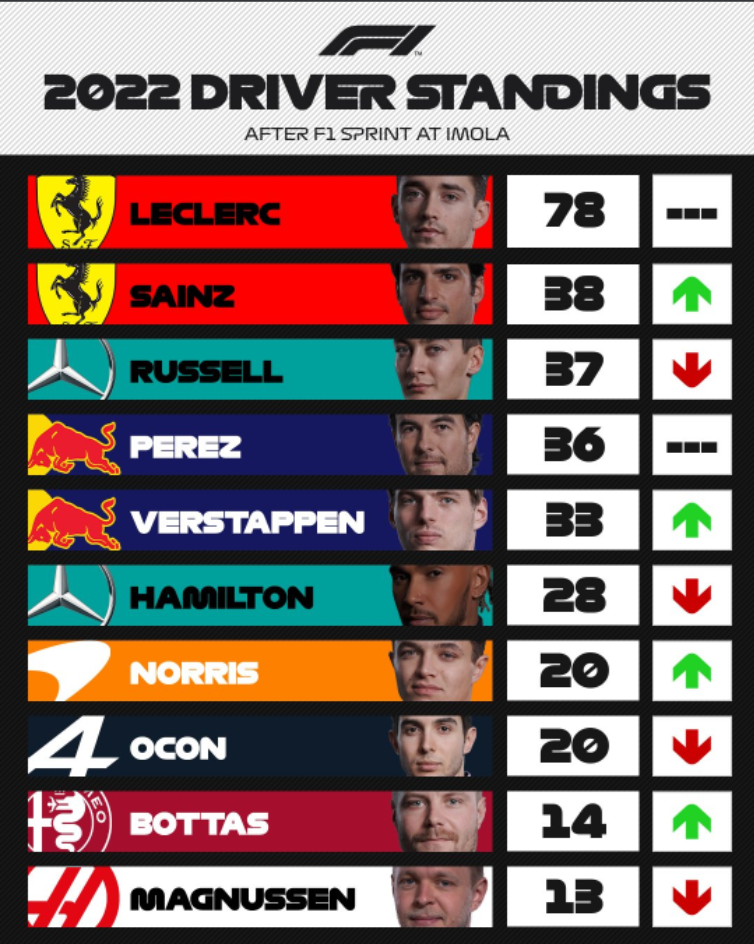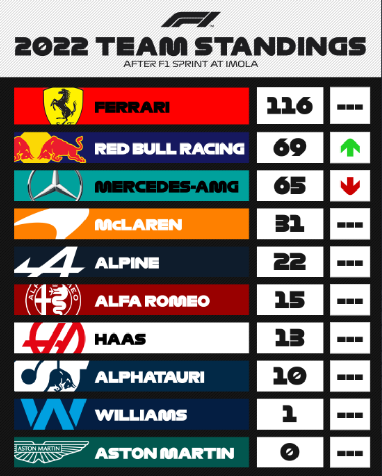 伊莫拉站冲刺赛赛后车手、车队积分榜