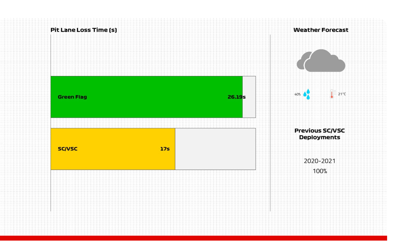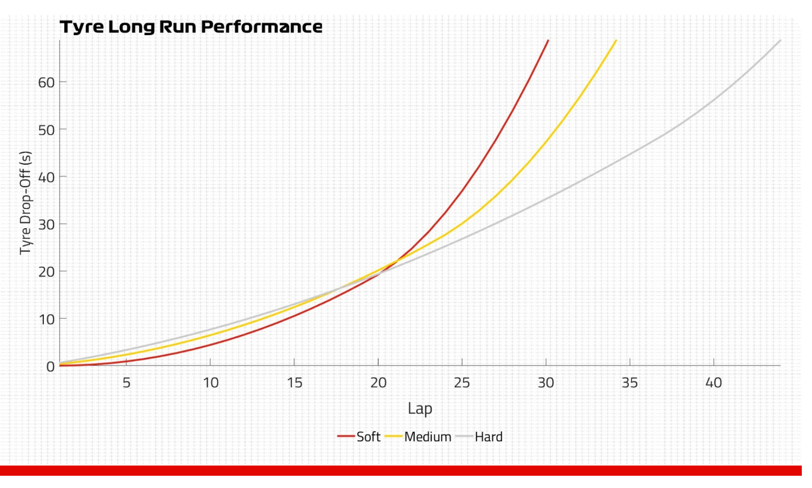 硬胎起步带来的长距离优势将为车队后续的策略选择提供较大的灵活性。车队可以选择在进站窗口开启后更换为中性胎(或安全车期间),或者尽可能跑得足够久,直到进入最后20圈更换为软胎。即使比赛后期降雨,使用硬胎起步的车手也只需要一停换为雨胎即可完成比赛。