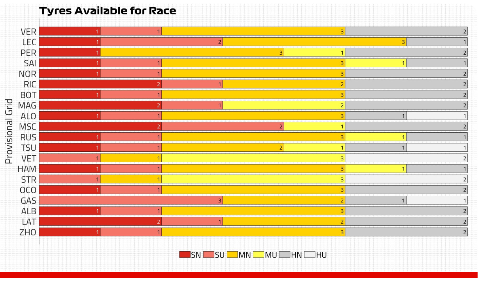 如果前排发车的车手希望通过采用不同的策略抵消一停战术的优势,软胎起步可能会是选项之一。软胎将在起步时提供抓地力优势,并帮助前排车手尽早提升位置并在前半段领跑比赛。