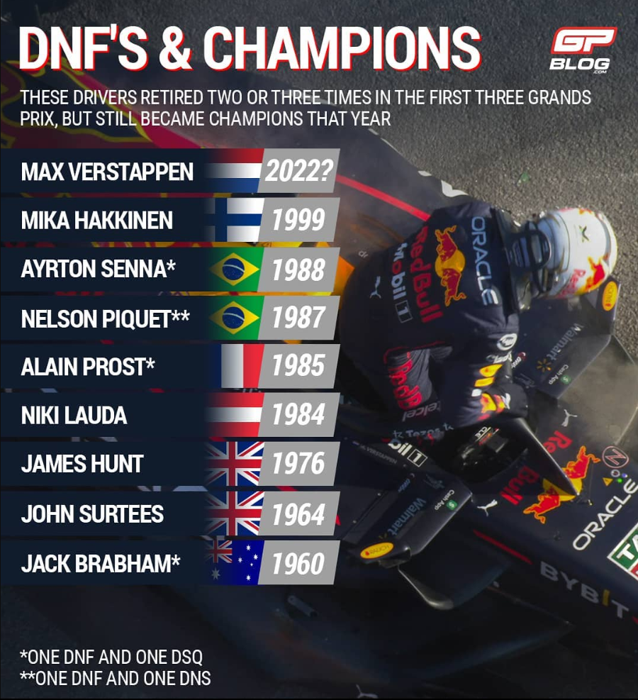 在F1的历史中,前三场比赛退赛两场却依旧拿下该赛季世界冠军的车手一共有8位。