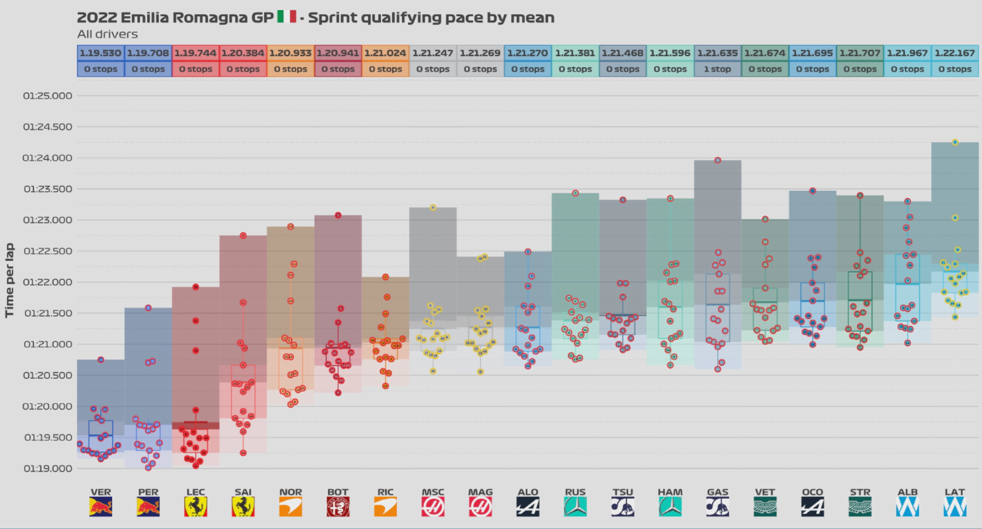 这张图展示了车手们在冲刺赛中的圈速区间(不包括安全车带领下的圈速,平均圈速越快越靠近横轴原点)。通过这张图我们可以看到,红牛和法拉利的表现一如既往的强势,均有很大优势,只不过维斯塔潘的表现更加稳定。而阿尔法罗密欧车队的车手博塔斯在冲刺赛中亦有亮眼表现,平均圈速排在第6位。哈斯车队两位车手的平均圈速均在前十以内。