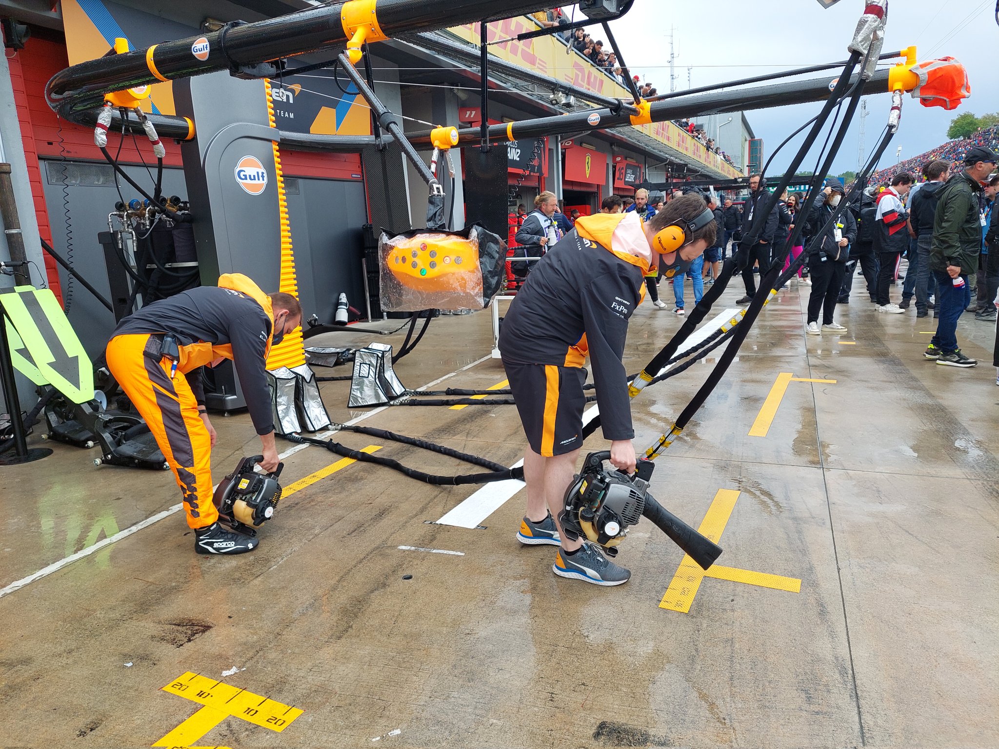 雨停了!迈凯伦车队正在吹干他们的维修区!