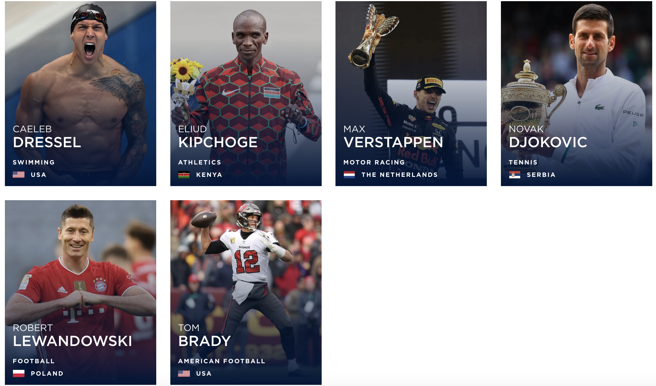最佳男运动员提名者包括:NFL传奇汤姆布雷迪、拜仁/波兰足球巨星莱万多夫斯基等6人。
