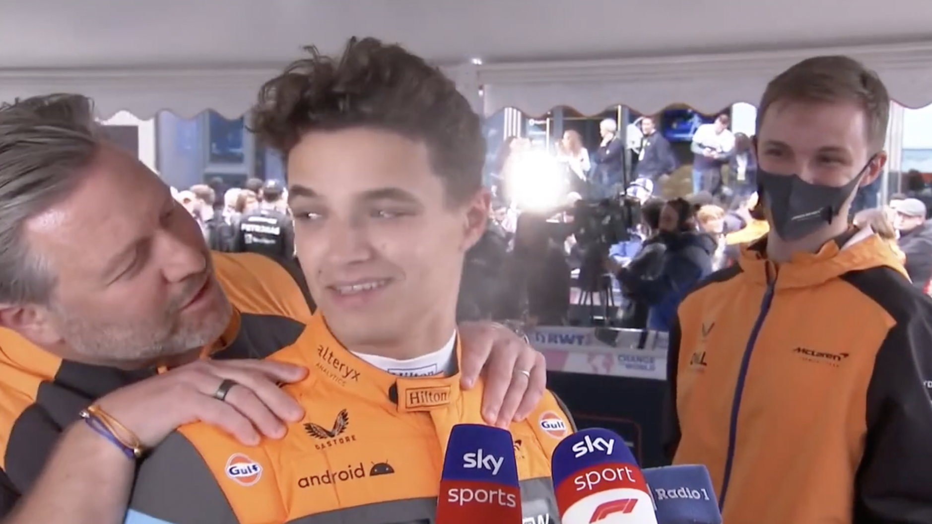 诺里斯在昨天赛后接受采访时,扎克·布朗突然出现在身后,拍着他的肩膀夸他干得漂亮。这动作真是太有爱了!