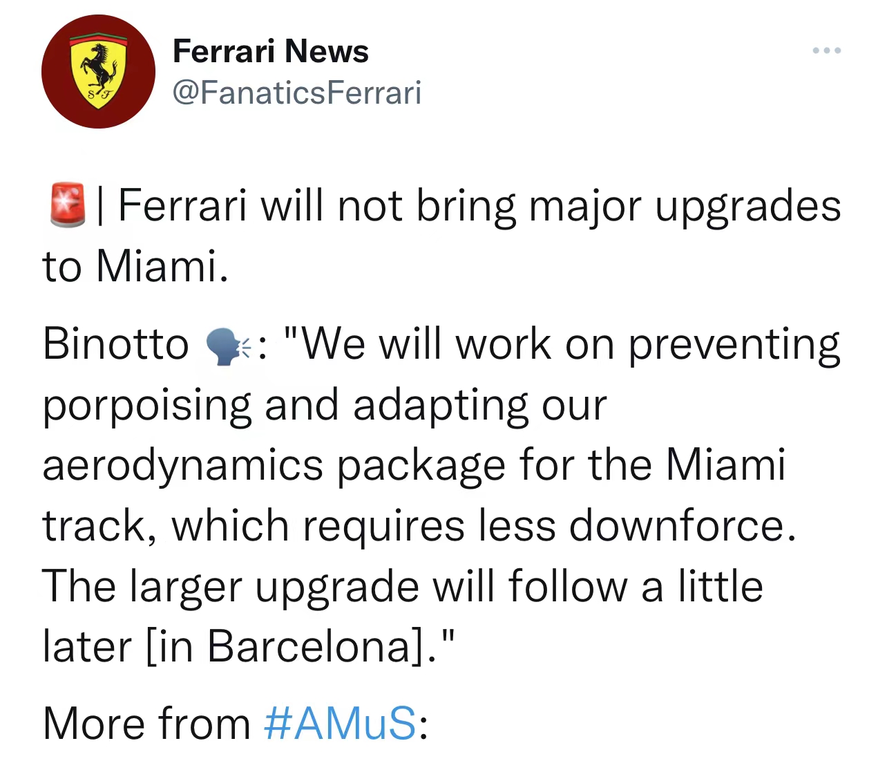 比诺托向AMuS透露:法拉利目前的主要目标是减少海豚跳,迈阿密赛道所需下压力较小,法拉利会对空气动力学套件进行调整。更大规模的升级会放在巴塞罗那。