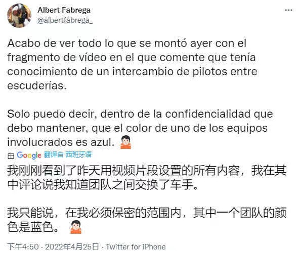 有一名Twitter网友将自己的账号伪装成了F1名记Albert Fabrega的账号,发布了一条两支F1车队要交换车手的消息。并说,其中一个车队的颜色是蓝色。