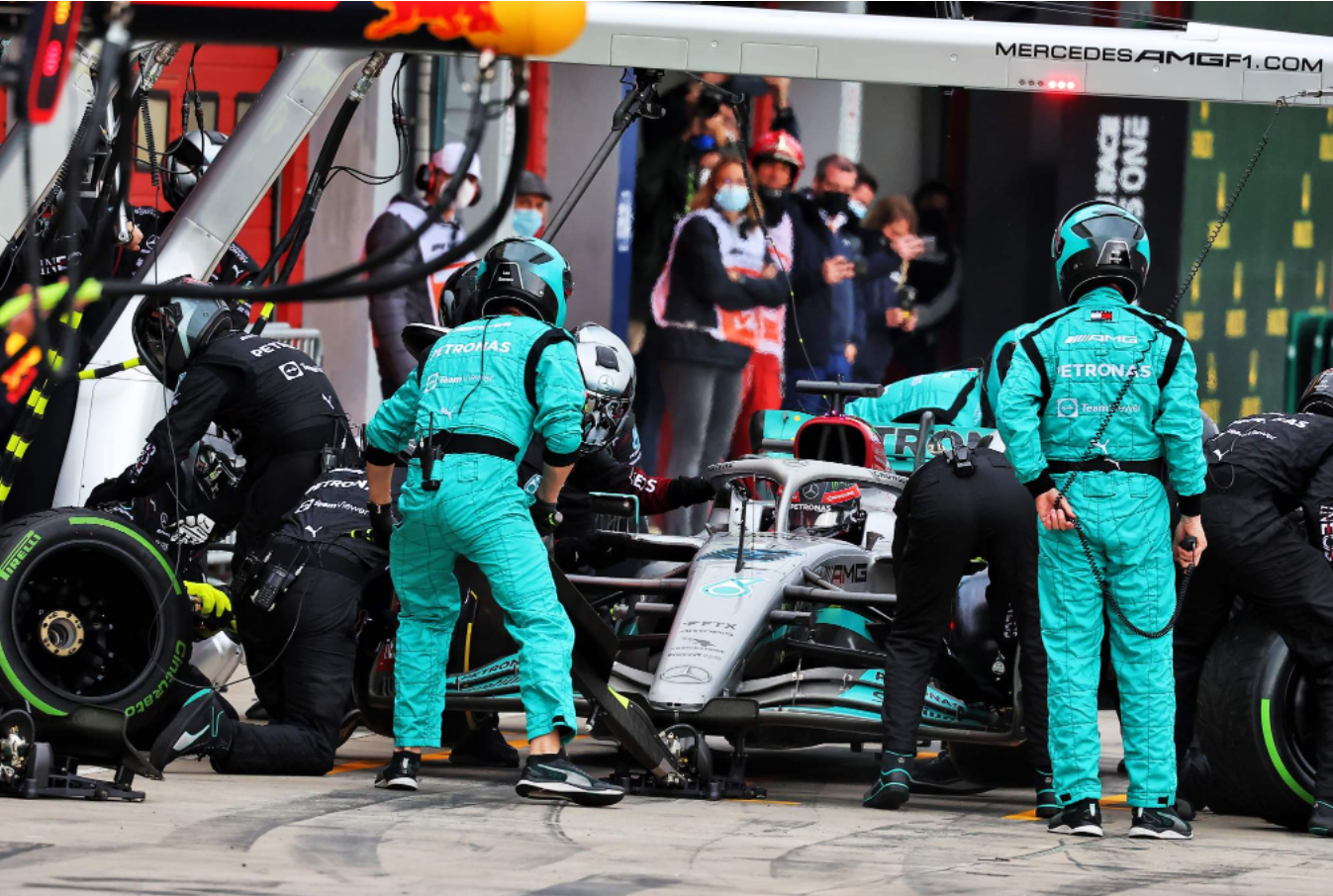 随着拉塞尔从勒克莱尔的打滑中受益,并且进一步受益于博塔斯进站时再次遇到的螺栓滑丝的问题,最终以第四名的成绩完成比赛,汉密尔顿在第13名,他们在排位赛中止步Q2,在冲刺赛中拉塞尔取得了第11名,汉密尔顿排在了第14名,因此在周日正赛中在赛道湿滑的一侧发车。